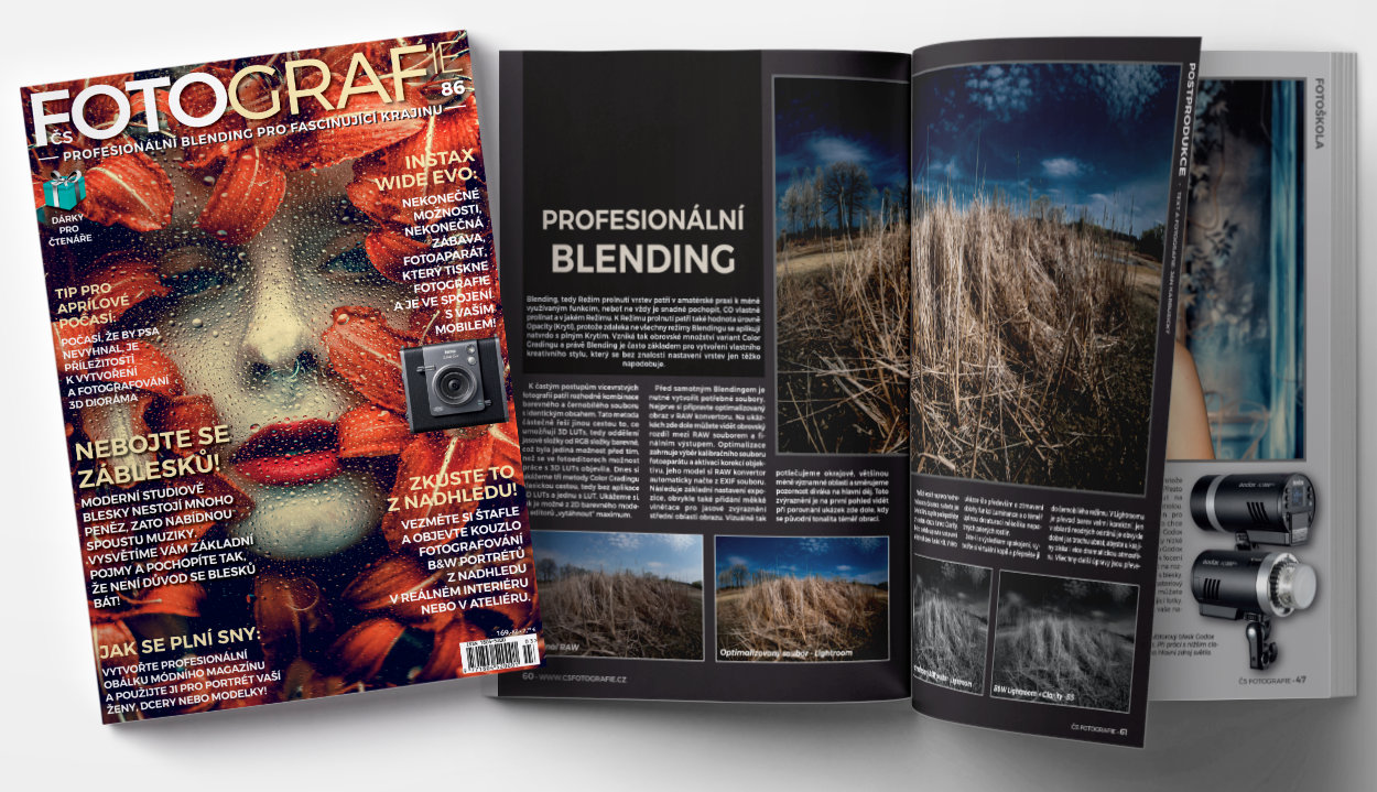 Magazín ČS Fotografie č.86 je v prodeji od 27.března a přináší osvěžující jarní čtení a neobvyklé náměty. Naučíme vás tvořit obálku módního časopisu, abyste dívkám a ženám mohli plnit jejich tajné sny, podíváme se podrobně na profesionální blending vrstev v krajinářské fotografii, kde vás výsledek určitě překvaí a nadchne. Ukážeme vám, jak vzniká precizní portrét i jak se fotí portrét z nadhledu (připravte si štafle), naučíme vás tvořit a fotografovat 3D dioráma a pro milovníky scénické fotografie tu máme fotografování na námět Lary Croft, včetně speciální dárkové LUT. Ono těch dárků je opravdu velký balík, nechybí šablona na obálku módního časopisu včetně potřebných fontů, ukázkové soubory ve vrstvách a čtyři skvělé 3D LUTs.